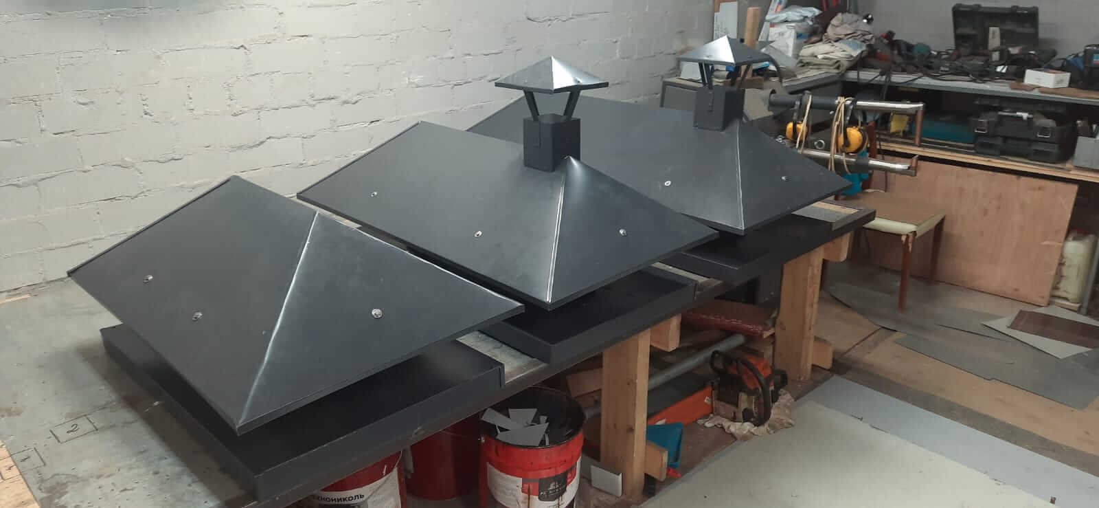 Заглушка водосточного желоба. Изготавливается с помощью вальцовочного и фальцегибочного станка, фасонная часть вырезается ножницами, зигуется и так же загибается на фальцегибе. Догибается с помощью молотка или фальцезакрывающей машинки листогиба. Способов ее изготовления множество.
