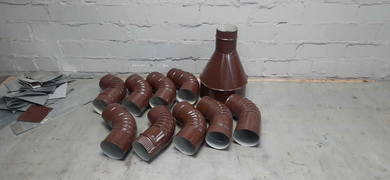 Делается с помощью станка гофроколено. К такому станку мы бесплатно дарим 4 матрицы нужного вам диаметра. Изготовление 1 колена на нашем станке занимает менее минуты.