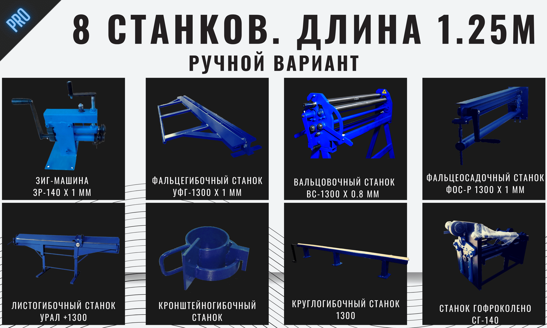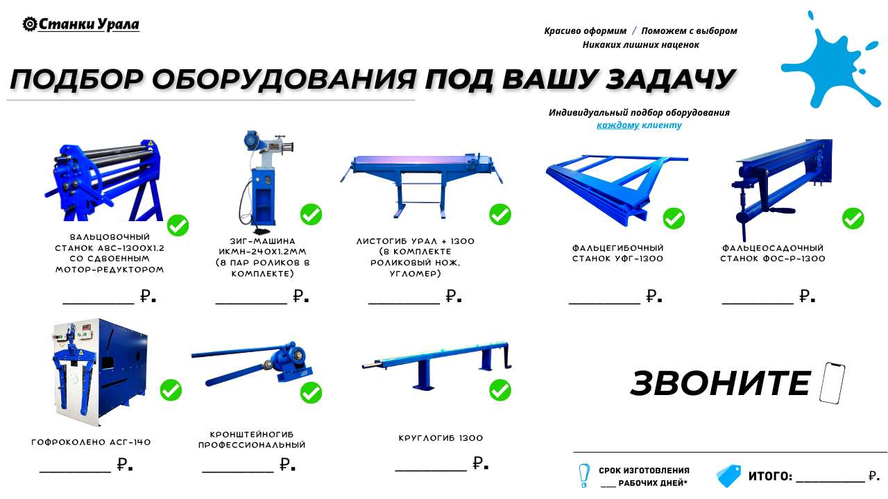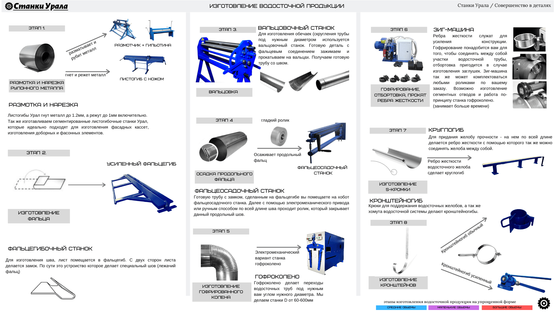 Для изготовления водосточной продукции Вам потребуются следующие станки: Листогибочный станок (гибка и резка металла), Фальцегибочный станок (изготовление фальца - шва для последующего соединения трубы), Вальцовочный станок (для того, чтобы преобразовать прямой лист металла в круглую трубу, скруглить его), Фальцеосадочный станок (для закрытия фальцевого соединения, шва), Зиг-машина (для изготовления сегментов, гофрирования, отбортовки или нанесения ребер жесткости), Круглогиб (для изготовления S-образного соединения желобов между собой и придания данному соединению большей жесткости) и кронштейногибочный станок (для изготовления крюков, кронштейнов). Дополнительно, для большего удобства стоит рассмотреть станок для изготовления гофроколена, так как он существенно снижает вашу производственную нагрузку и быстро окупается за счёт того, что детали, изготовленные на данном станке (гофрированные трубы) выглядят более качественно, чем если бы вы изготавливали сегментный отвод использую зиг-машину.