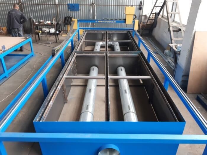 Наиболее эффективный вариант дымоудаления – установка подвижного стола под которым повторяя ход портала расположен приемный ящик для сбора мелких деталей с встроенной системой дымоудаления. Преимущество этого способа в том, что удаление образовавшегося дыма происходит с большей тягой непосредственно в месте обработки металла. Данный стол представляет собой сварную конструкцию и имеет специальный трубопроводный канал с подведенной раздвоенной трубой.