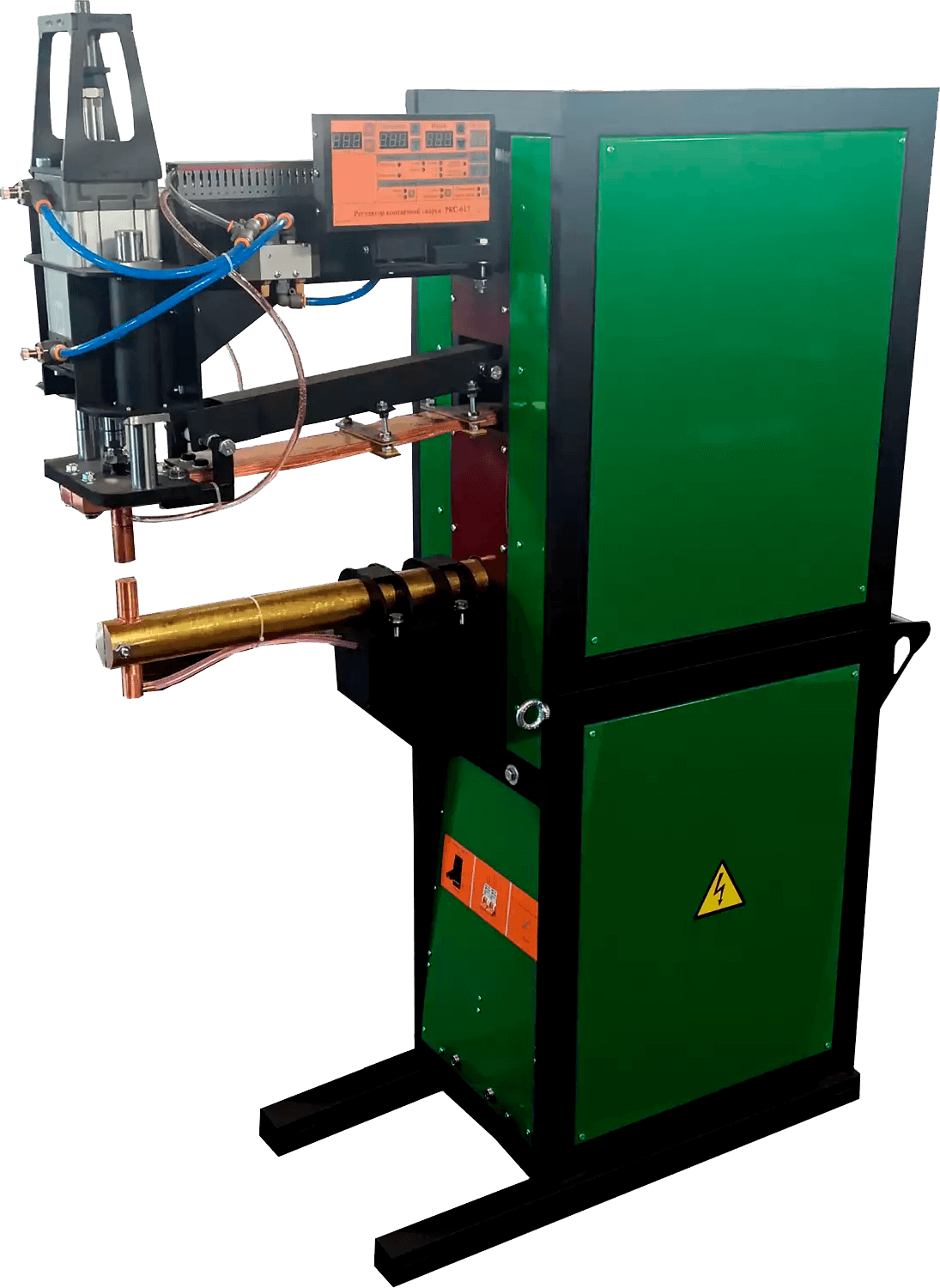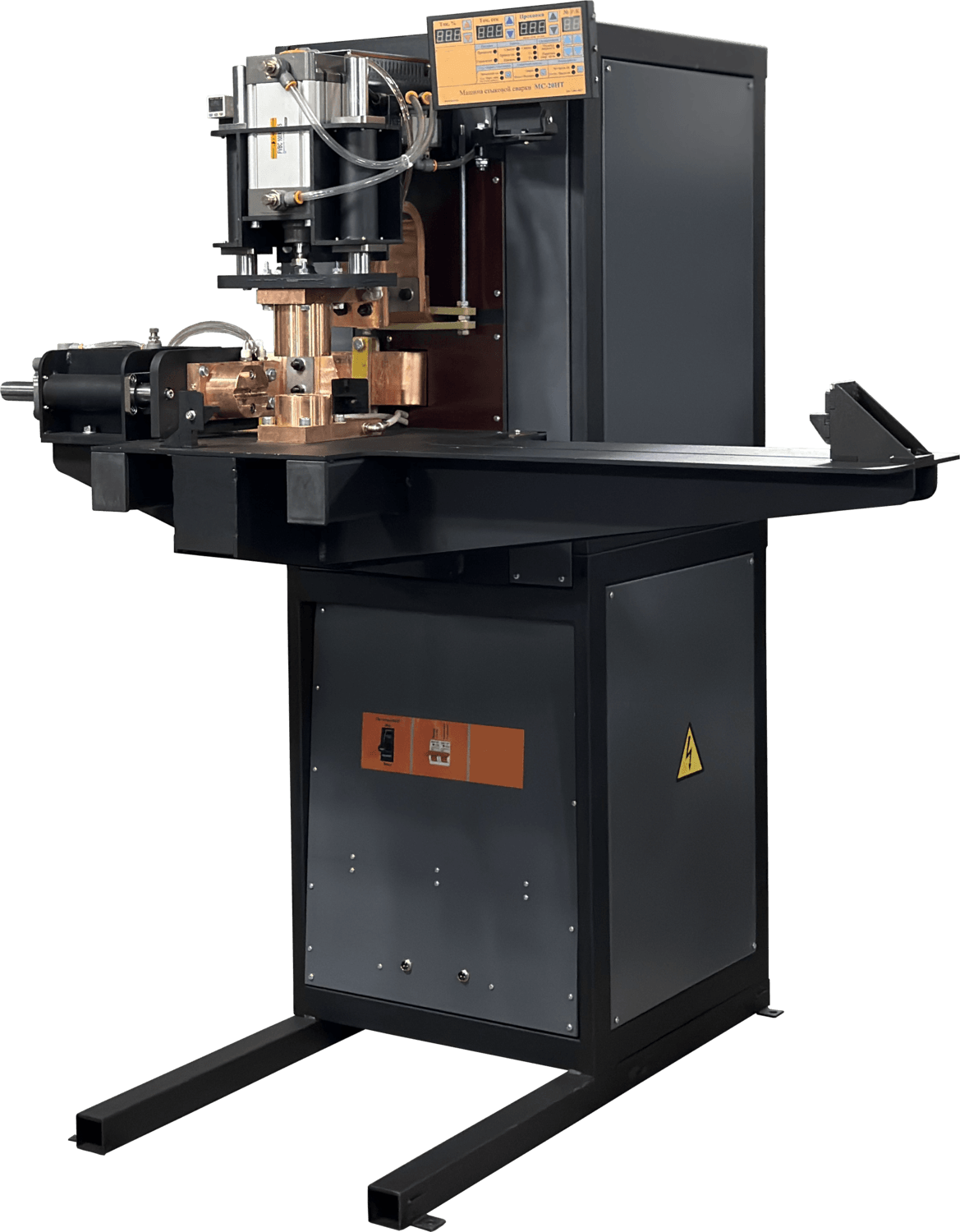 Достаточно протянуть к машине сеть 380 В, больше ей ничего не нужно. По мощности и производительности не уступает машинам контактной сварки со сварочным током до 17 кА,предназначенным для промышленного производства больших заводов.В то же время машину могут поднять и погрузить на тележку 3 человека, а передвинуть ее на 1-2 метра можно и в одиночку. Также её можно поднимать любым грузоподъёмным устройством.