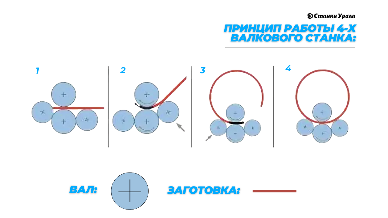 Основная работа проделывается четырьмя валками, два поперечных валка с двойным прижимным действием, и два боковых валка, которые задают радиус гиба заготовки, что позволяет прокатывать без прямых участков с подгибкой с обеих сторон, обеспечивая точность и высокое качество обечайки.