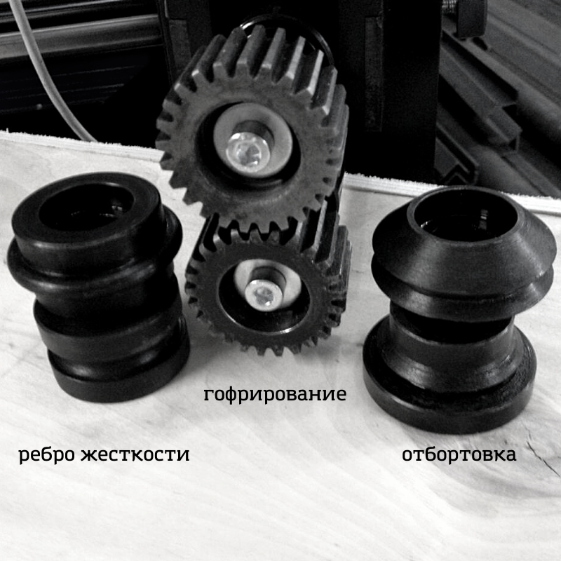 В базовой комплектации три пары роликов: Ролики для гофрирования, отбортовки и проката ребер жёсткости. Можно доукомплектовать роликами для осадки шва сегментного колена, BB-роликами, а также смежными роликами для одновременного проката ребра жесткости и выполнения гофрирования. Также можем изготовить любые другие виды роликов под заказ